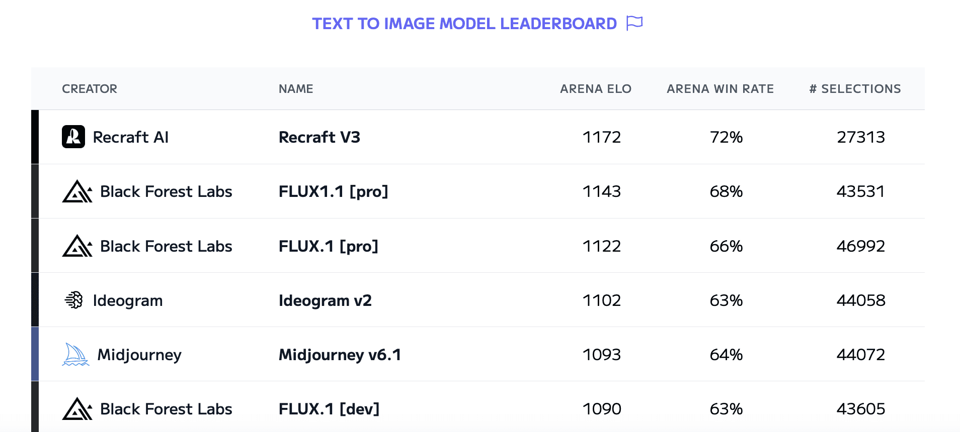 Recraft V3 stands out from other models thanks to its unique advantages that make it a leader in the field of image generation and editing. Moreover, leading global rankings, such as the Hugging Face Text-to-Image Benchmark, have recognized it as the best among competitors, including Midjourney and OpenAI. Recraft V3 has surpassed all competitors, including Midjourney and OpenAI, and secured the first place with an impressive ELO rating of 1172.